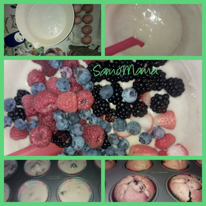 Vse sestavine, razen jagodičevja sem premešala v gladko zmes in nato nežno vmešala še jagodičevje.