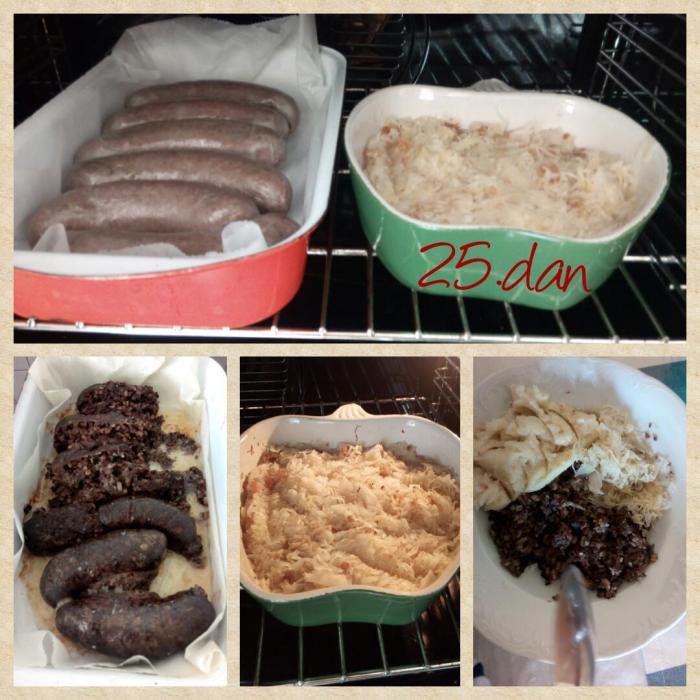* Kislo zelje v pečici: Kislo zelje sem za 10 minut pokuhala v vodi, ki sem jo potem odlila, da ni bilo prekislo. Zelje sem zabelila z ocvirki in presula v pekaču. Začinila nisem nič, ker je bil okusen že sam po sebi. Popekla sem v pečici (160° C, pribljižno 20 minut).