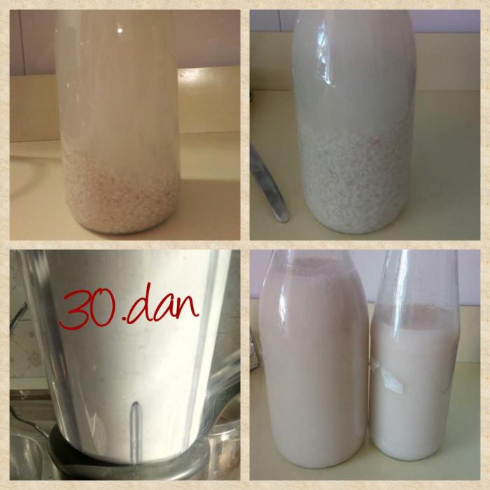 Rižev napitek (poskus št.3): na sončničnem olju sem prepražila skodelico riža, potem prelila s tremi skodelicami vode, solila. Tako sem pustila čez noč in zjutraj z blenderjem zmiksala. Precedila sem, še dodala vodo in na hitro zavrela. No, to je bila napaka… Hotela sem, da bi mi zdržal za cel teden, a sem pozabila, da škrob ob kuhanju naraste oziroma zgosti.