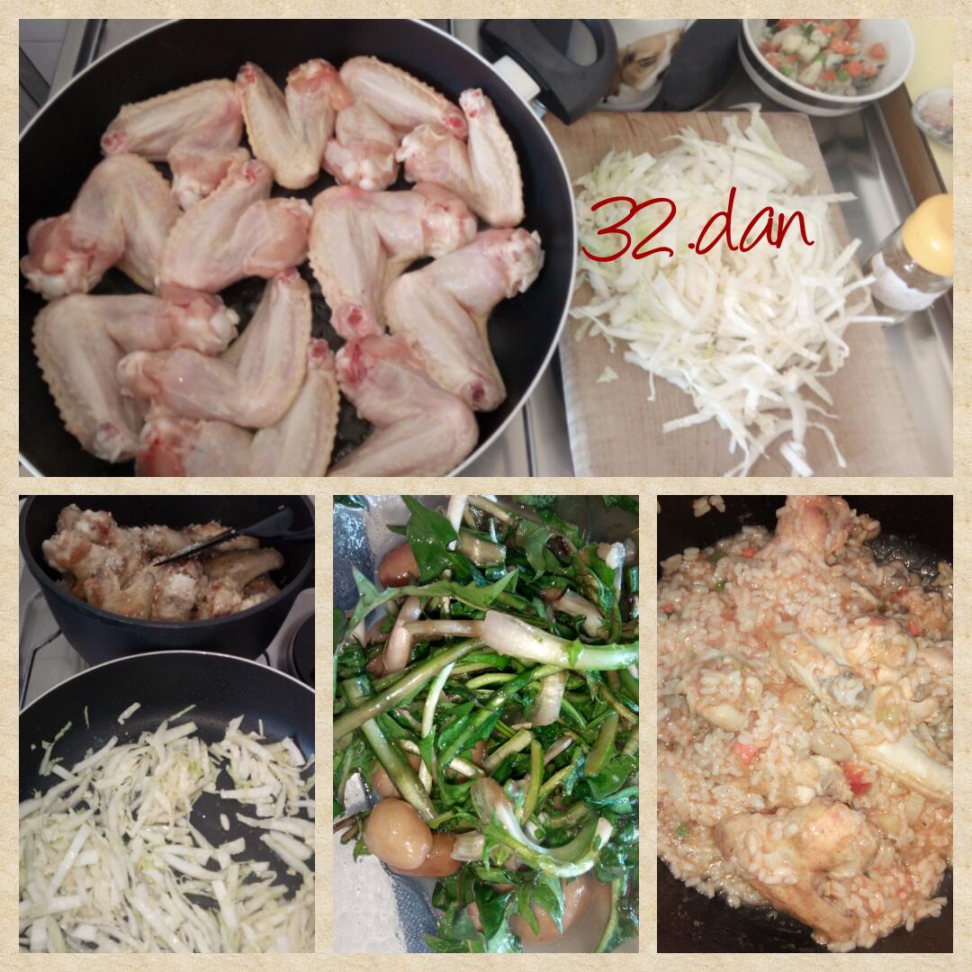 * Rižota s perutničkami in kitajskim zeljem: Perutničke sem popekla in dodala skledico riža, da je posteklenil. V drugi ponvi sem prepražila kitajsko zelje in zmrzjeno zelenjavo. Nato sem vse skupaj združila v enem loncu in zalila s tremi skodelicami vode. Začinila sem le s soljo in posušeno zelenjavo, na koncu se z domačo paradižnikovo omako.