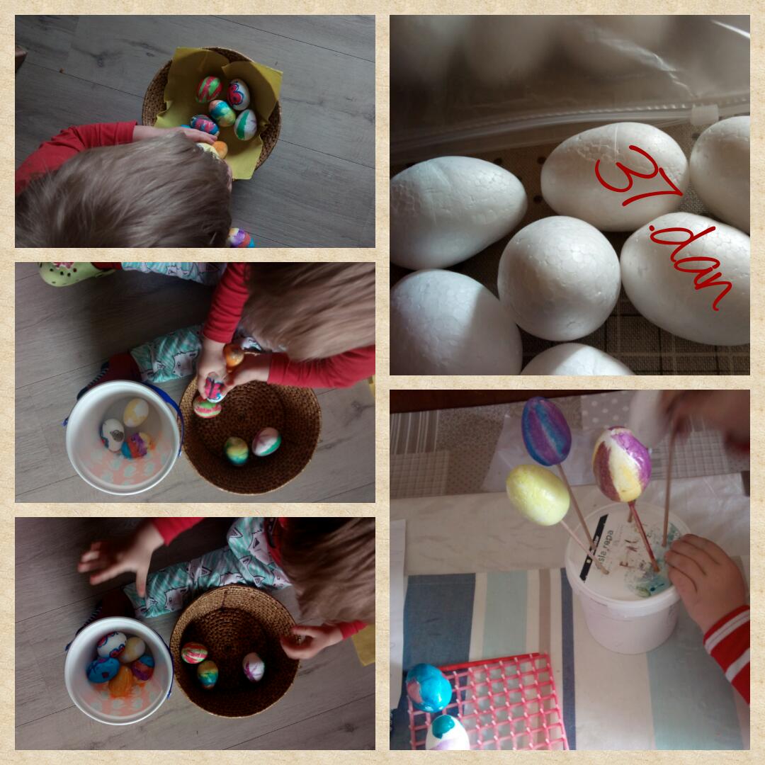 Medtem ko je Jurij spal, smo se lotili ustvarjanja velikonočnega vzdušja. Barvali smo stiroporna jajčka, ki so tudi odlična igrača za dvajsetmesečnega veseljaka.