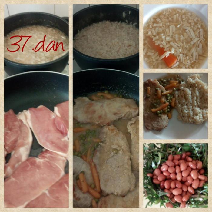 – svinjski zrezki v naravni omaki s korenčkom in grahom ter