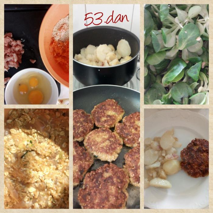 * Zelenjavno mesni polpeti: Svinjsko meso sem zrezala čimbolj na drobno. Prepražila sem čebulo in česen. V posodi sem zmešala 1 nariban korenček, 1 naribana bučka (iz skrinje), ovseni kosmiči, prepražena čebula, meso, sol, domača sušena zelenjava, 2 jajca (jaz sem dala 2 mala domača in eno veliko) ter sezam. Vse skupaj sem premešala in pustila počivat. Tik pred peko sem dodala drobtine in oblikovala polpetke, ki sem jih ocvrla na olju.