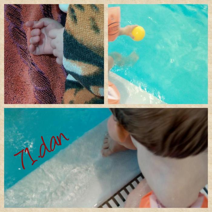 Nič kaj nedeljsko se ni začel dan. Vreme zunaj oblačno, zato sva se odločila, da gremo na bazen. Imamo ga vsega 10 minut stran. Otroci so bili navdušeni. Naši mini je bila voda malenkost prehladna, zato je izkoristila čas za globok spanec.