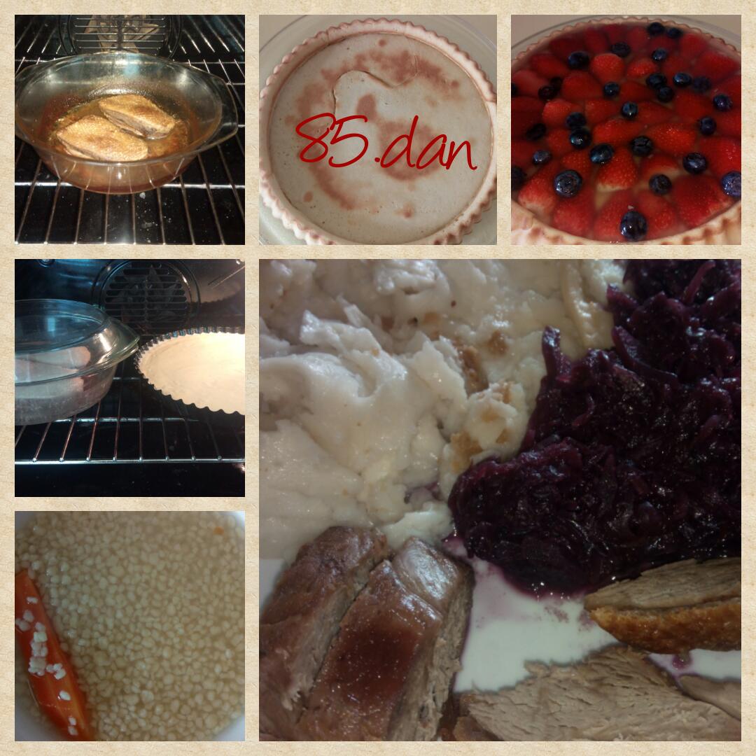 Za kosilo smo naredili ‘martinovo kosilo’. Ker imamo to kombinacijo zelo radi, smo v času martinovega kupili več račjih prsi in skuhali več rdečega zelja, oboje sem spravila v skrinjo. Za sladico sva s Hano spekli biskvitno podlago, na katero sta z Jurijem potem z očijevo pomočjo naložila jagode in borovnice. Zalila sem z želatino (preliv za torte).