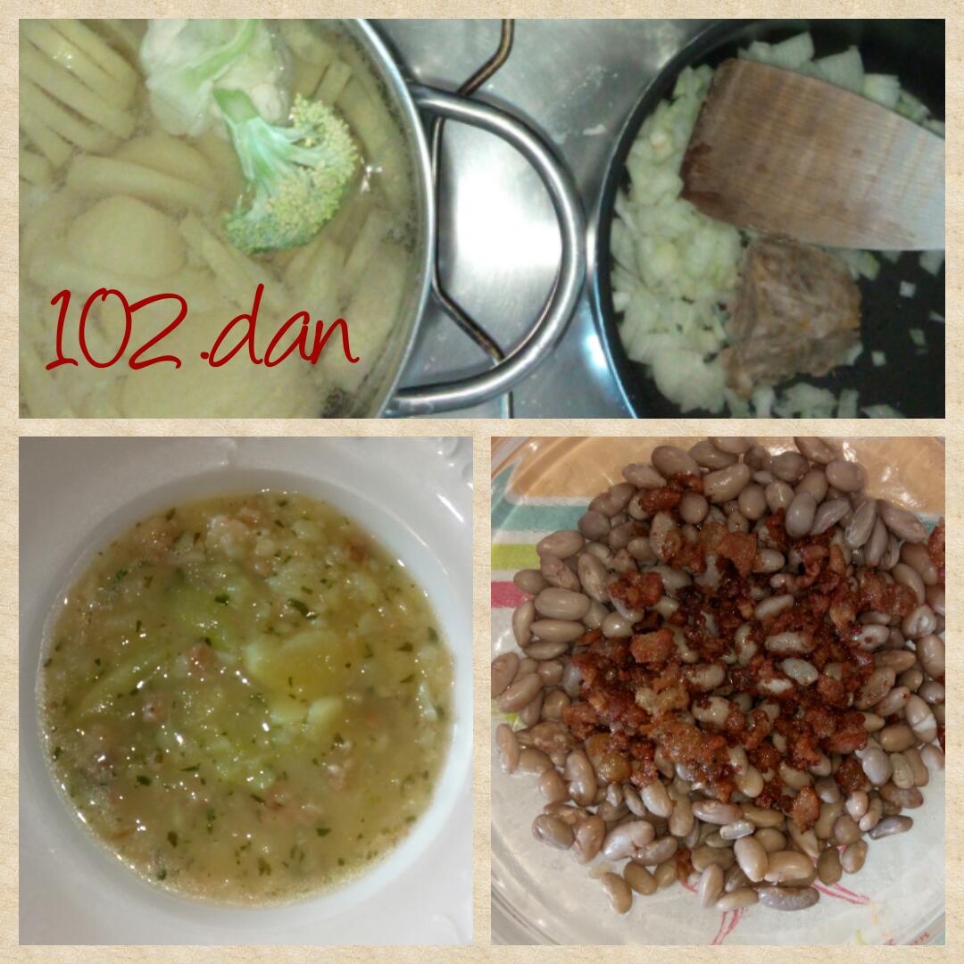 Za deževen dan paše nekaj na žlico. Malo sem pobrskala po skrinji in našla še naribane kumare in fižol v zrnju. Pa smo jedli hmeljarsko kosilo.