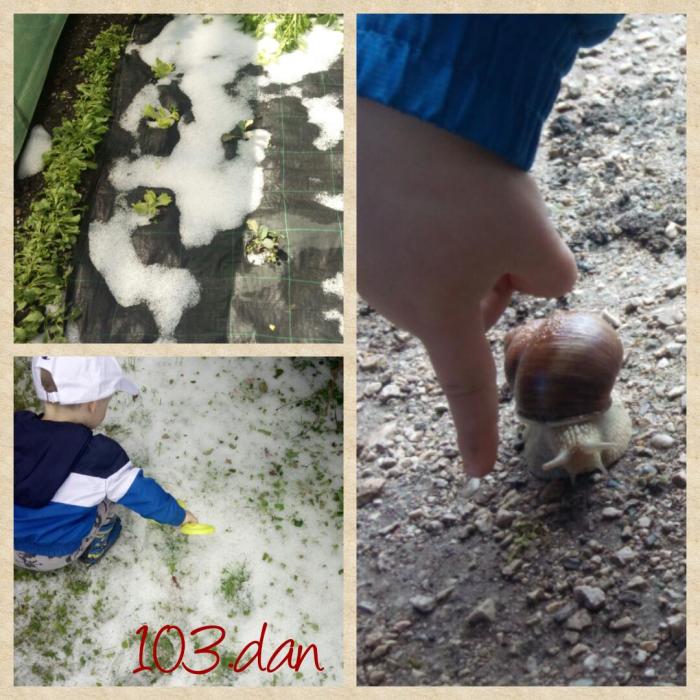Nočno neurje s točo, nam je pobelilo trato in vrt. Večje škode ni videti, upam, da se ne bo ponovilo. Ima pa Jurij novega prijatelja. 😉 Velikega vrtnega polža.