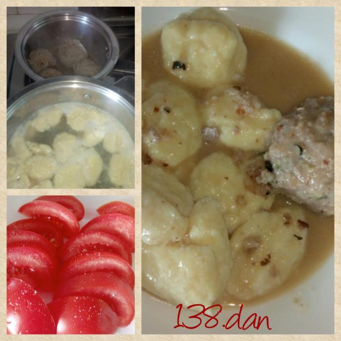 Od zajtrka mi je ostal mlečni zdrob. Dodala sem jajce, moko in sol ter skuhala v vreli vodi žličnike. Od doma smo prinesli mesne kroglice (čufte), ki sem jih popekla in zalila z ovseno ‘creme’.