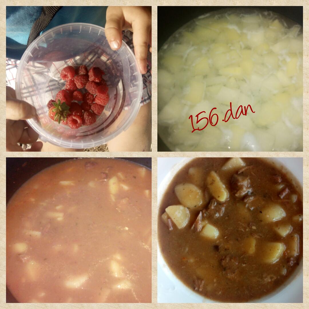 * Golažova juha s krompirjem: Iz skrinje sem vzela golaž. Krompir sem olupila, narezala na drobne koščke ter skuhala v slani vodi. Vanj sem vlila odtaljen golaž in prevrela.