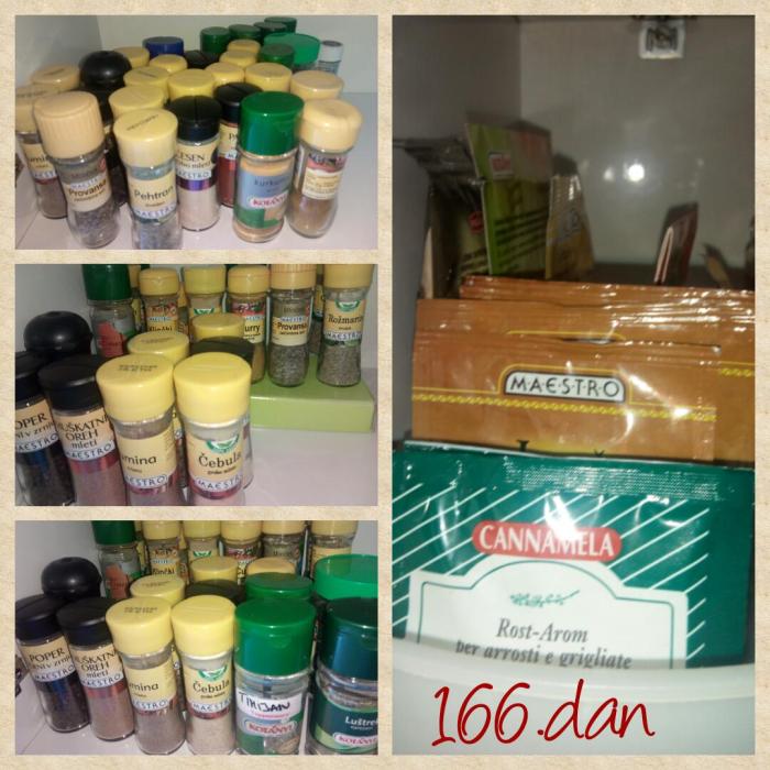 Največ dela sem imela s predalom z začimbami. Malo zaradi pregledovanja datumov uporabnosti, veliko zaradi količine le teh. Da bi bile začimbe malo bolj pregledne sem v ozadje omare dala pokrov od škatle za čevlje (sem vedela, da si moram kupiti nove čevlje!). Začimbe sem nekako ločila po namembnosti. Zadaj na ‘polički’ so začimbe za sladice ter mediteranske in azijske, spredaj pa te ko najbolj uporabljam. Malenkost bolj je sedaj pregledno. Verjetno do prvega obiska mojega dragega, ki ponavadi vse premeče 😉.
