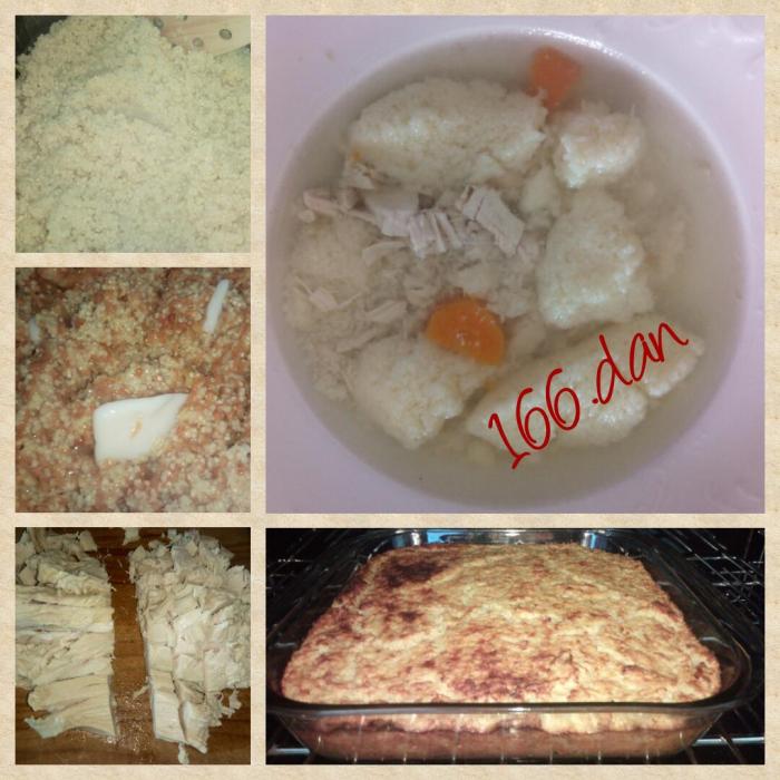 – goveja juha s koščki piščančjega mesa, korenjem in zdrobovimi žličniki ter