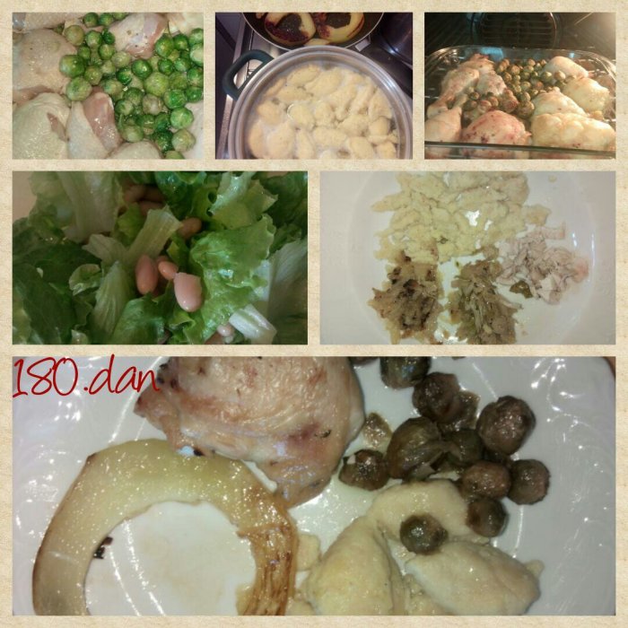 – pečena bučka, brstični ohrovt, piščančje meso, zdrobovi žličniki.