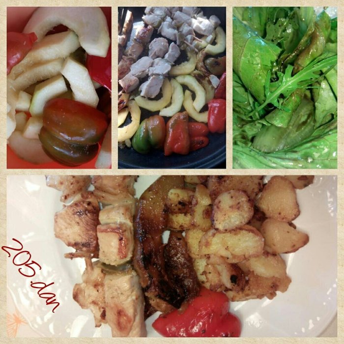 – popečena bučka in piščanec pokuhana s krompirjem.
