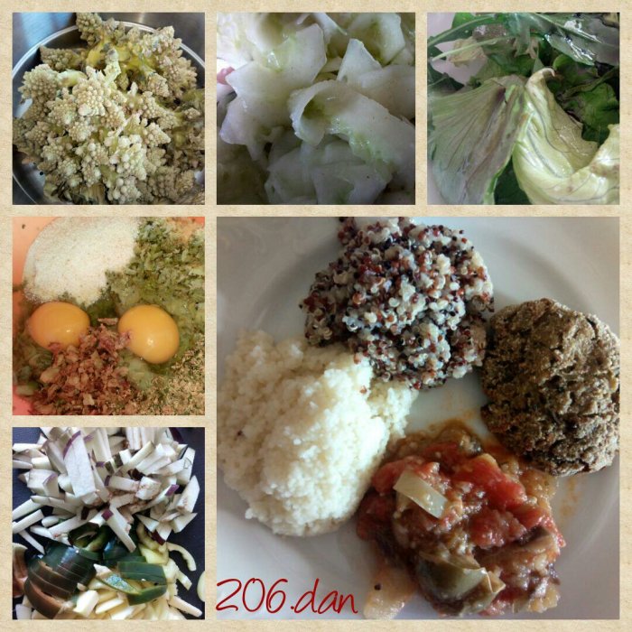 Danes sem naredila popolno, zdravo in uravnoteženo kosilo, ki pa nam ni šlo v slast. Imela sem domačo zeleno, zašiljeno cvetačo (cvetača Romanesco) in da bi bilo malo drugače sem iz nje naredila cvetačne polpete. No, okus cvetače je bil premočan, tako da me je rešla svakinja, ki je bila nad njimi navdušena. 😉 Za prilogo sem skuhala tribarvno kvinojo, ki pa se je izkazala za zelo ‘lupinasto’, zato sem zraven skuhala še kuskus, za rezervo, ki pa se je ves pojedel, za razliko od kvinoje. 😜
