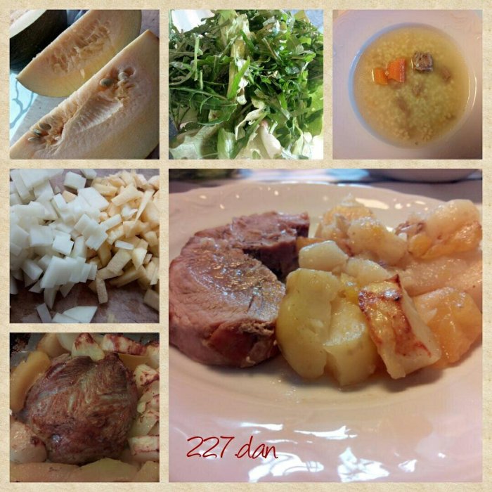 – goveja juha (kot mi), zmečkan krompir z bučo, zabeljen z oljčnim oljem.