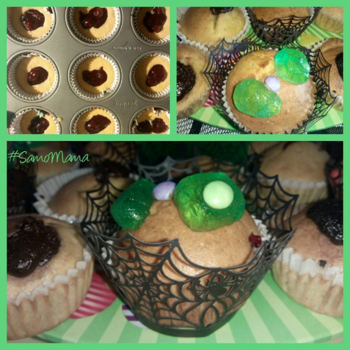 Za noč čarovnic pa sva s hčerko iz istega testa naredili kolačke. V srajčke sva dali žličo testa, žličko jagodne marmelade ali čokoladnega namaza in še žlico testa. Pečene sva okrasili z želejčki, sladkorjem in bonbončki.