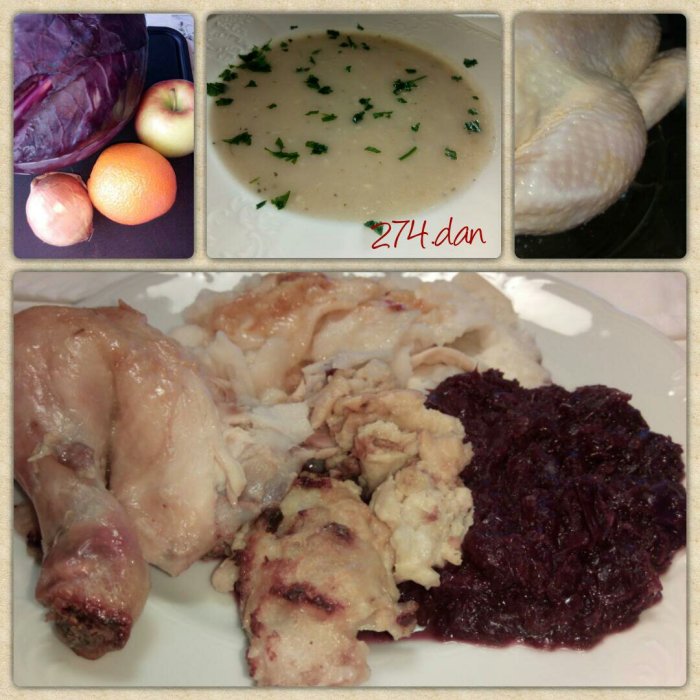 Doma pa se lotili našega Martinovega kosila. Za začetek smo skuhali česnovo juho, nato napolnili piščančka z filo (2 žemlji, drobovina, jajce, ocvrta čebula) ter ga spekli, dušili rdeče zelje in na koncu še napojili mlince z vodo.