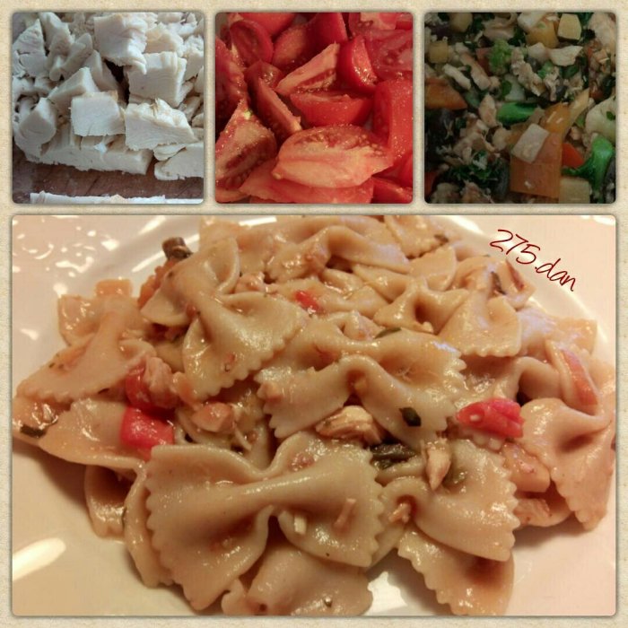 * Omaka iz včerajšnega piščanca in zelenjave: ostanke včerajšnega pečenega piščanca sem na drobno narezala in skupaj z nasekljano čebulo prepražila, nato sem dodala nasekljan česen in zmrznjeno zelenjavo ter zalila z vodo. Ko je bilo kuhano sem zgostila z žličko koruznega škroba ter paradižnikovo omako. Začinila sem samo s soljo in zmešala s kuhanimi polnozrnatimi makaroni.