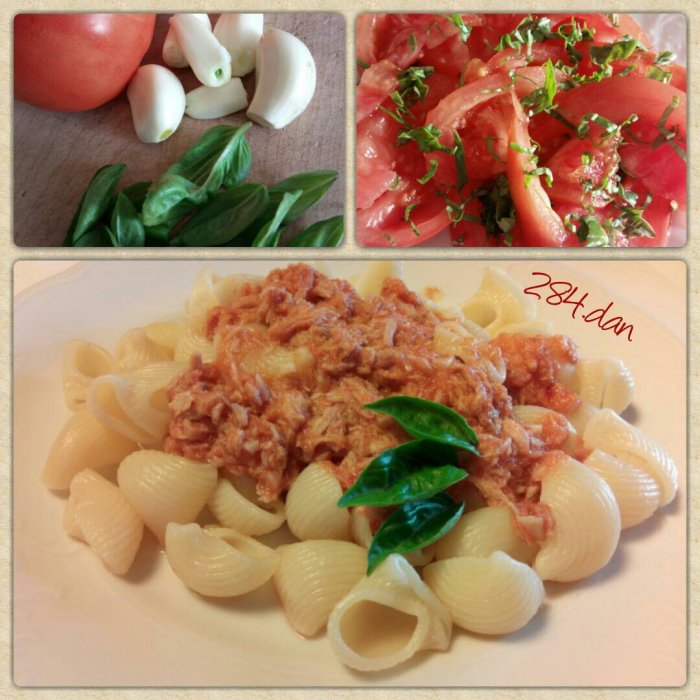 – paradižnikova omaka s tuno ter paradižnik z baziliko (ja, še vedno domač 😉)