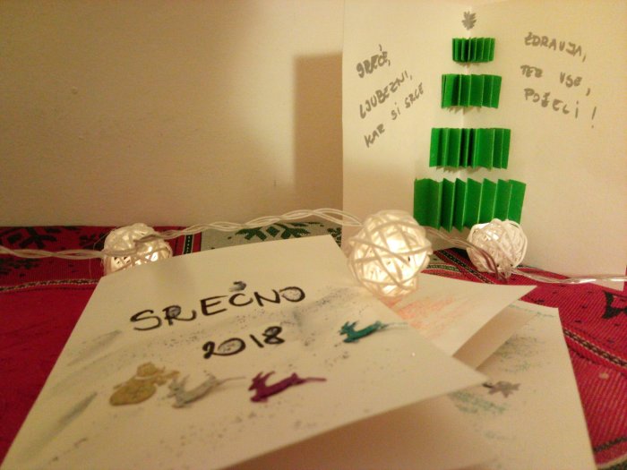 Letos smo se lotili izdelave že sredi novembra. Najprej sva si z najstarejšo hčerko ogledali možne voščilnice na spletu in izbrali najbolj všečno, ki jo po svoje dopolnjujemo. Za ta Božič bomo pošiljali smrečice.