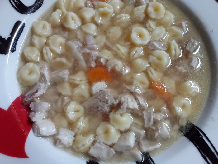 Skuhala sem 4 piščančja bedra in 2 narezana korenčka. Dodala sem jušno kocko in skuhala. Posebej sem skuhala makarončke in jih dodala juhi. Meso sem razkoščičila.