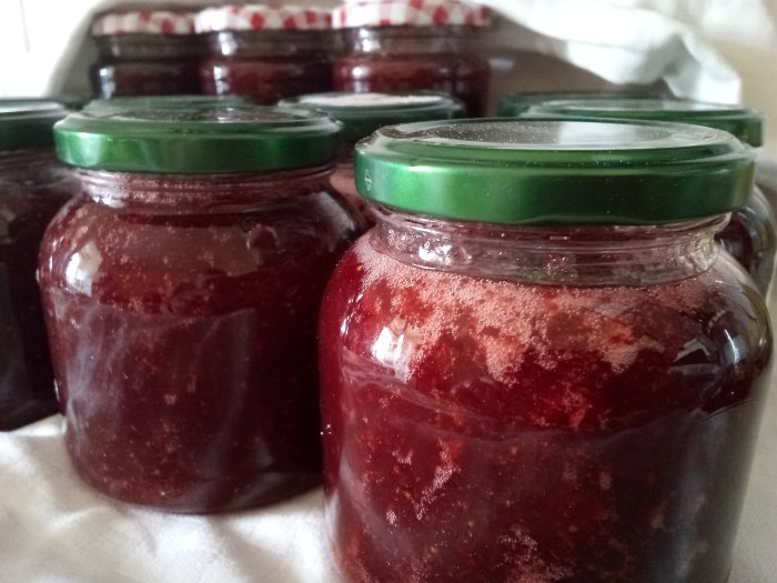 Skuhali smo tudi jagodno marmelado. Uporabili smo 4 kg jagod, 2 kg sladkorja, 10 g citronske kisline (po okusu), 3 pakete želirnega sredstva 2:1. Jagode sem skupaj s sladkorjem in citronsko kislino pokuhala in s paličnim mešalnikom spasirala (ne popolnoma) ter ohladila. V ohlajeno sem dala želirno sredstvo (po navodilih na vrečki) in dobro mešala do vrenja. Kozarčke za vlagat sem v pečici zagrela na 100°C in vlila v njih marmelado. Dobila sem 12 malih (2dl) kozarčkov marmelade.