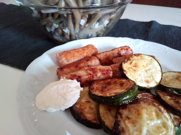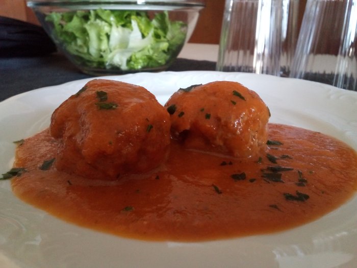 Mesne kroglice: Prepražila sem nasekljano čebulo in na koncu dodala še nasekljan česen, da je zadišal ter ohladila. Dodala sem pol kg mletega mesa, sol, domačo sušeno zelenjavo, peteršilj in vse skupaj dobro premešala. Iz mase sem naredila mesne kroglice, ki sem jih popekla na oljčnem olju. V drugem loncu sem skupaj pražila čebulo, bučko in rdečo papriko. Zelenjavo sem zalila z 1l paradižnikove omake in spasirala s paličnim mešalnikom. Omako sem dosolila in ji dodala mesne kroglice ter prevrela.