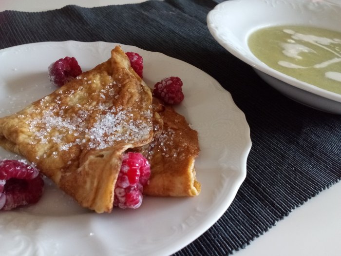 Špargljeva juha: Šparglje sem narezala in jih popekla na maščobi, zalila z vodo in pokuhala (10 minut). S paličnim mešalnikom sem jih spasirala in precedila, da so se odstranile nitke. Začinila sem s soljo in domačo sušeno zelenjavo. Po potrebi se lahko juhca zgosti z gustinom (jaz sem zgostila z indijskim tropotcem) in zabeli s smetano.