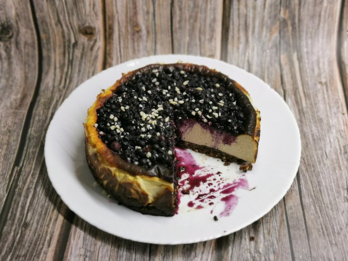 Pečeno skutino torto damo na krožnik in dodamo jagodičevje.