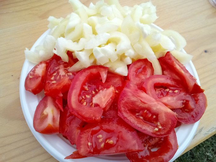 Krompirjev golaž (čebula, česen, bučka, sladka rdeča paprika, sol, krompir): prepražila sem čebulo, bučko, česen in sladko rdečo papriko ter zalila z malo vode in spasirala. Posebaj sem v slani vodi skuhala na kocke narezan krompir in ga stresla v ‘omako’ iz bučk. Vse skupaj sem pokuhala. Klobaso sem skuhala in dodala narezano v krompirjev golaž.