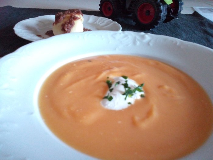 Korenčkova juha: 4 korenčke in 2 krompirja sem skuhala, začinila in spasirala s paličnim mešalnikom.