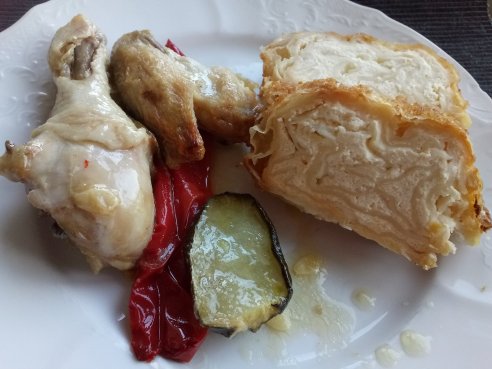 - v pečici pečena zelenjava in piščančja bedra ter perutničke
