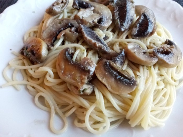 Šampijone sem zrezala in jih prepražila na oljčnem olju skupaj s česnom. Dodala sem še nasekljan petršilj in solila. Na koncu sem zalila s sladko smetano in polila po skuhanih špagetih.