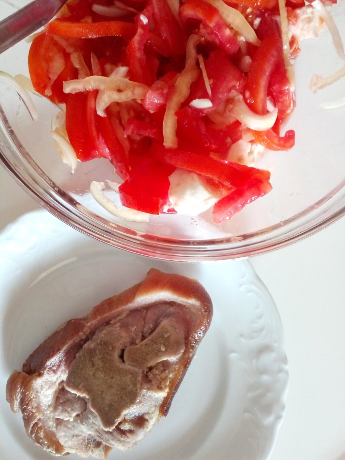 - paradižnikova solata s papriko, mocarelo in čebulo
