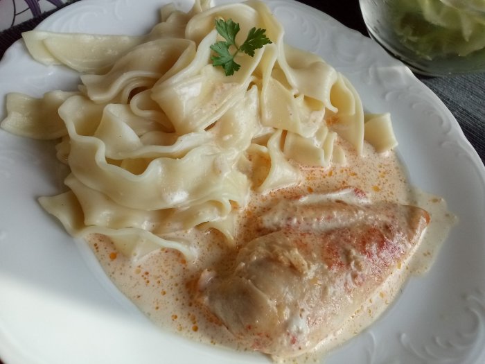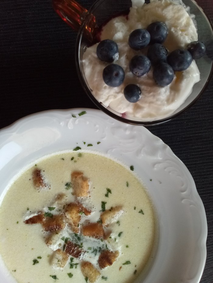 Omaka: jušno zelenjavo (kolerabo, čebulo, zeleno, korenje, . . .) sem spasirala s paličnim mešalnikom, začinila in dodala smetano.