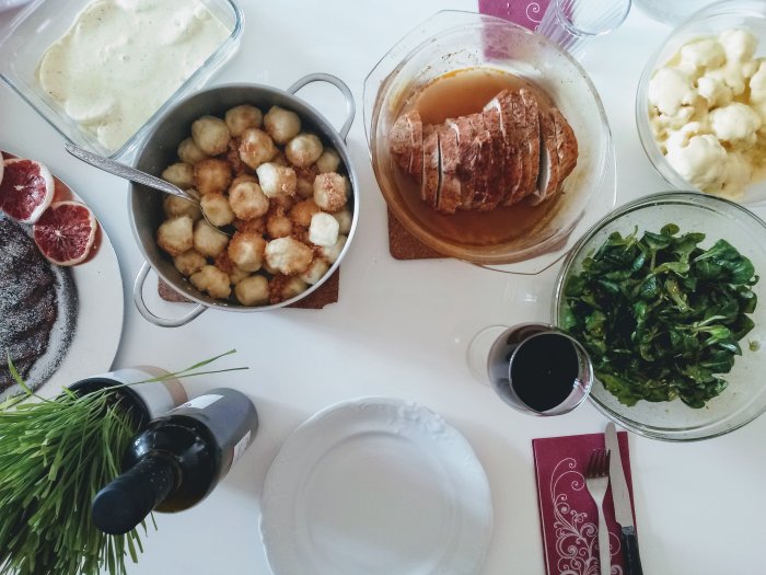 Pri nas nimamo božične večerje, ampak božično kosilo. In to nas lahko pohvalim, kosilo pa nam je uspelo! Svinjska pečenka, skutini knedelčki, jajca v tatarski omaki, cvetača v domači majonezi in motovilec v solati so se pripravili s skupnimi močmi. S prazničnim kolačem in kozarcem vina pa smo zaključili božično kosilo.