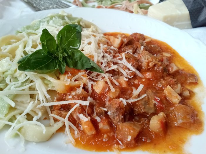 Pečene testenine: testenine sem skuhala, odcedila in ohladila. Dodala sem na drobno nasekljano šunko, mortadelo, sir (ostanke od narezka prejšnjega dne), 2 jajca, sladko smetano, sol ter vse skupaj premešala in dala v steklen pekač. Posula sem z naribano mocarelo in polovičkami češnjevega paradižnika. Spekla sem v pečici.