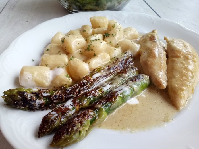 Narezane jurčke damo v pekač in rahlo začinimo (sol, mlet česen, petršilj) in na njih položimo začinjene svinjske zrezke. Pečemo v pečici (175°C) dobre pol ure, vmes enkrat do dvakrat premešamo jurčke in obrnemo zrezke, da se ne izsušijo preveč. Sama pečem v steklenem pekaču.
