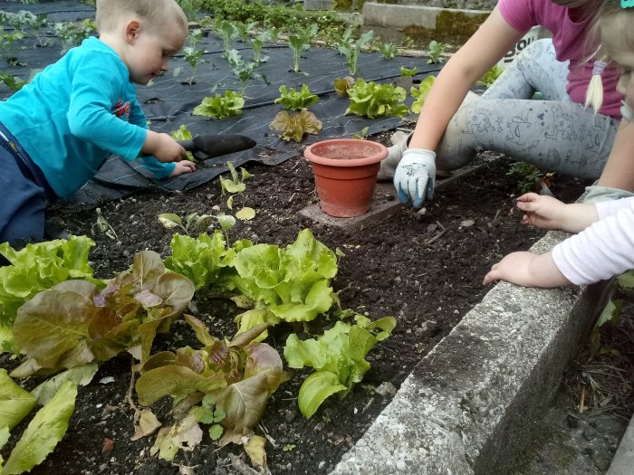 Na svojem vrtičku pa so pridni tudi otroci. Skrbijo, da je opleto in zalito.