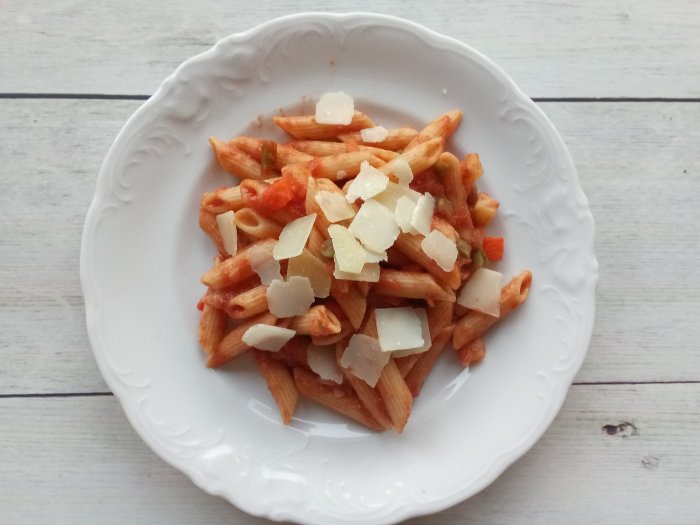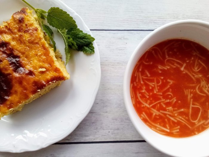 - Pečene testenine (ostanke od prejšnjega dne sem zalila z jajčko in smetano, posula s sirom in spekla)