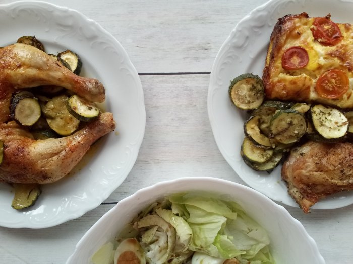 - Pečene bučke in piščančja bedra (v pečici, spodaj bučke, na vrhu bedra)