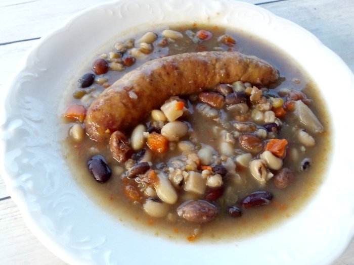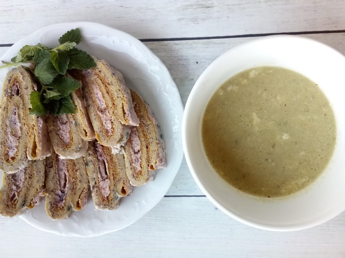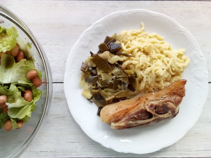 LCHF: juha s piščancem in jajčnim cvetom, hrustljava račka, pekoče zelje, . . .