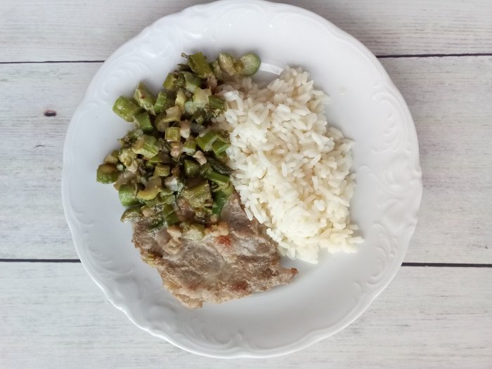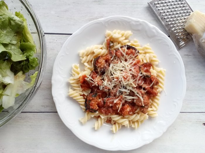 LCHF: pečene bučke s koščki svinjine in paradižnikovo omako, solata