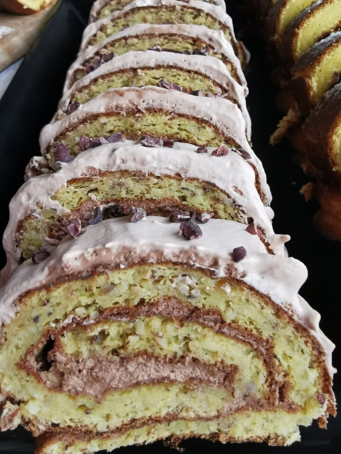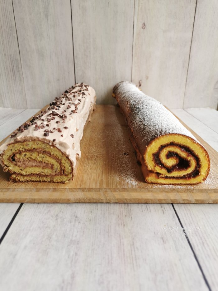 Lešnikova rolada in navadna rolada (z moko), namazana z domačo marmelado.