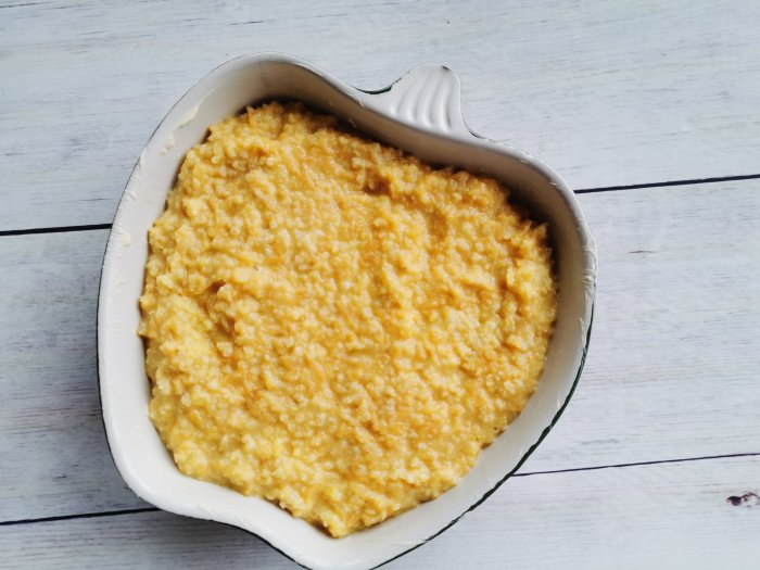 Jajca, smetano, sladkor in začimbe premešamo in dodamo ohlajena dušena jabolka in ohlajen riž.