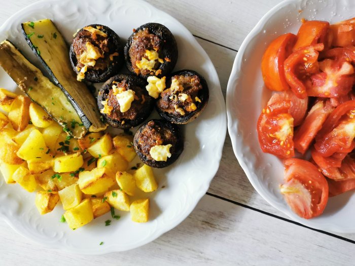 - Polnjeni rjavi šampinjoni z mletim mesom in s feto sirom
