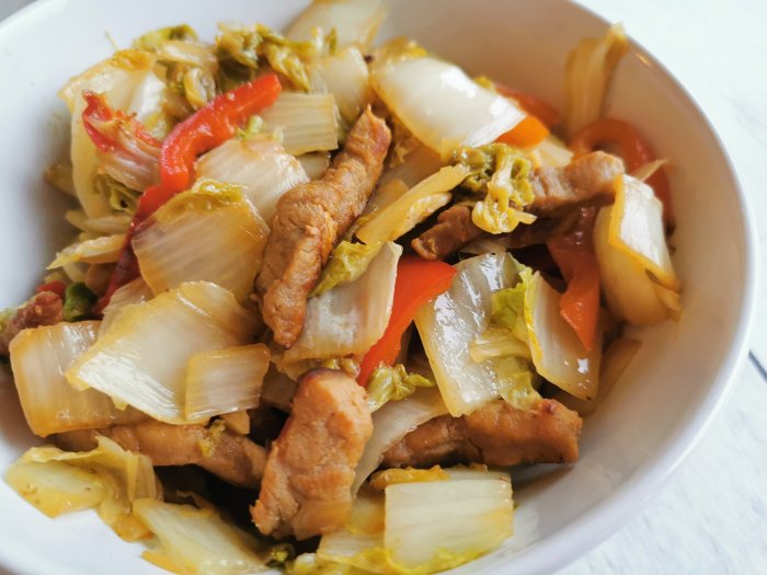 Piščančje meso nasolimo in na malce olja popečemo iz obeh strani. Meso damo na krožnik in v isti ponvi prepražimo narezano čebulo, ki začne dobivati barvo ji dodamo narezan česen in narezano kitajsko zelje, vse skupaj prepražimo, po nekaj minutah dodamo meso. Po potrebi dodamo malo vode in skupaj dušimo v pokriti posodi še nekaj minut, tako da se meso toplotno obdela.