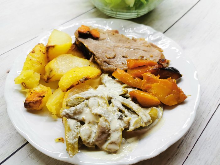 LCHF : suha juha z vmešanim jajcem, pečena hokaido buča, stročji fižol v smetanovi omaki, svinjska mrežna pečenka, zelena solata, čokoladno pecivo