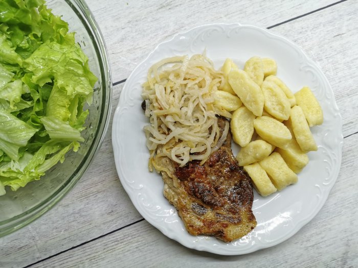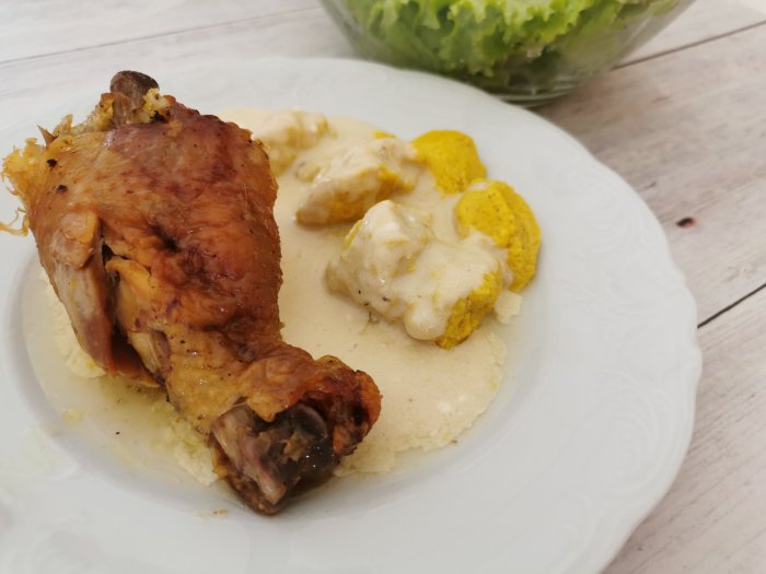 LCHF : bučni pire, domač pečen piščanec, zelena solata, potratna potica