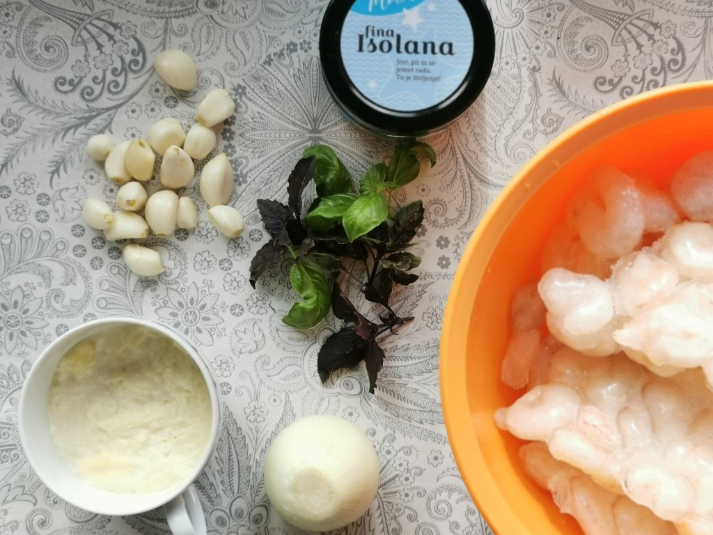 - 500 g očiščenih kozic